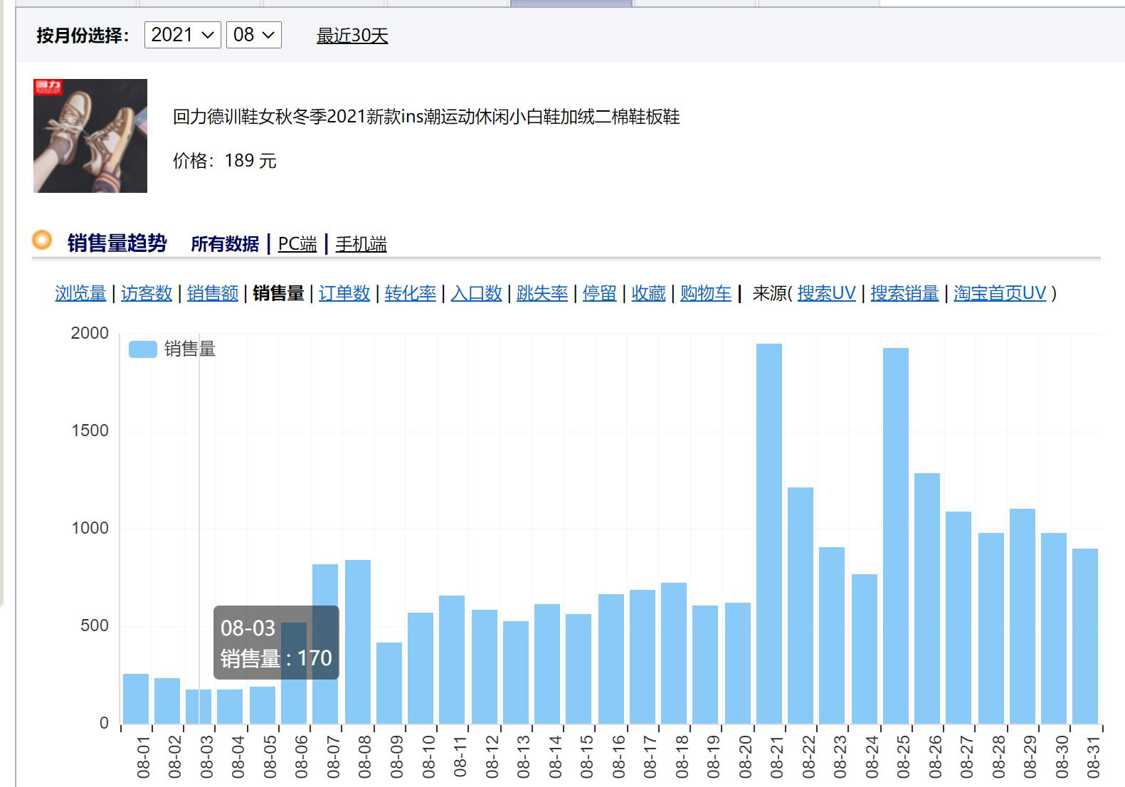 回力茂竹鑫專賣店,接手之前為第六層級店鋪,7月份銷售額 284萬,日銷900單左右。8月份接手后,對店鋪產品進行分析, 篩選出具有爆款潛質的商品,一款德迅小白鞋,日銷200左右, 通過加大直通車跟超推投入,一周內日銷達到600多,增長了 3倍,3周后日銷維持在1000單左右。通過多品類產品布局,7 月份的銷售額對比9月翻了3倍,10月份銷售額破千萬。